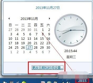 1、点击桌面右下角时间,然后在弹出的窗口中点击“更改日期和时间设置”。