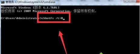 2、在“命令提示符”窗口,输入命令:chkntfs/t:0,回车。