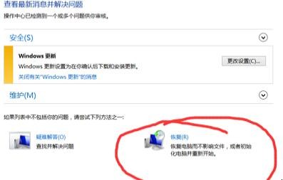 2、进入“操作中心”窗口后,点击下方的“恢复”,然后选择第四项进入“更新和恢复”。