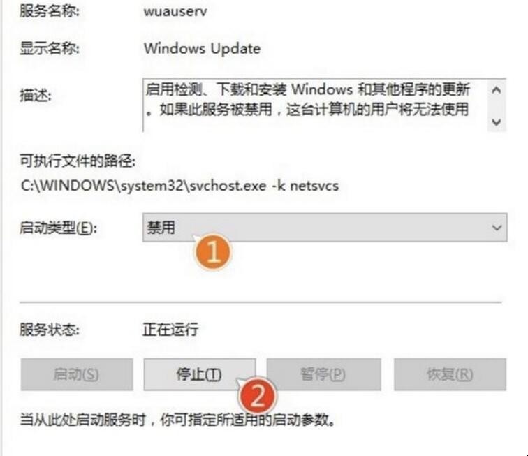 3、将启动类型改为“禁用”,点击“服务状态”下面的“停止”按钮。