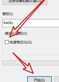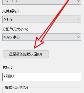 2、在打开的格式化窗口中点击“还原设备的默认值”按钮。
