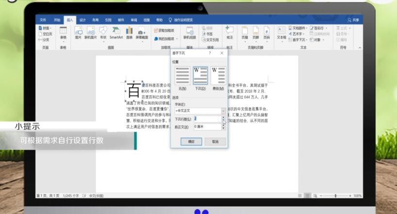 3、点击“首字下沉选项”,可根据需要自行设置下沉行数。