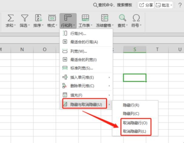 2、点击“隐藏与取消隐藏”,根据需求选择“取消隐藏行”/“取消隐藏列”。