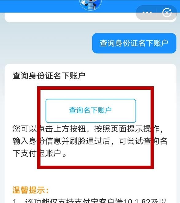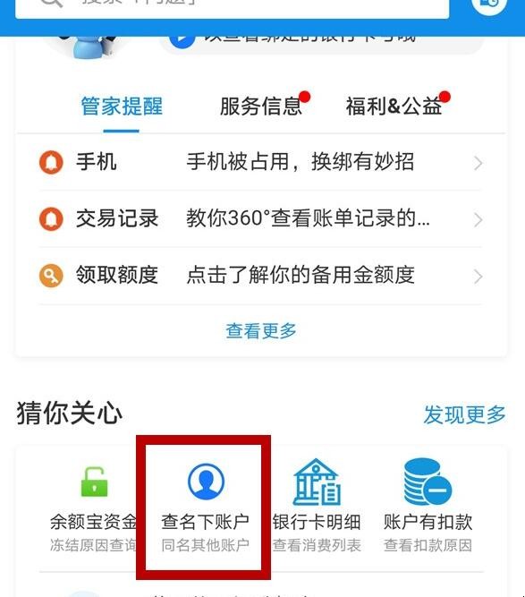 4、点击首页的【查名下账户】,或点击底部【在线咨询】。