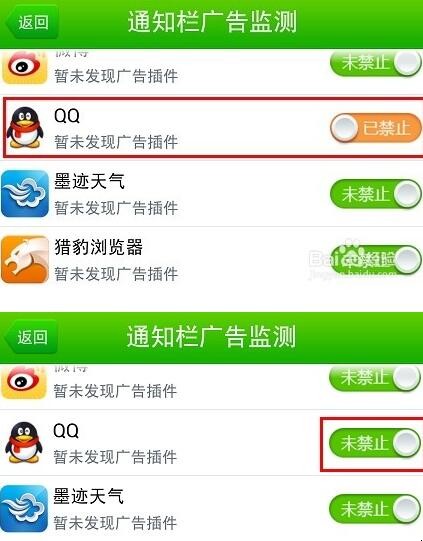 2、点击“通知栏广告监测”,展开“推送过消息的软件”列表,如图所示。可以看到手机QQ消息被禁止在通知栏显示了,点击按钮取消禁止即可。