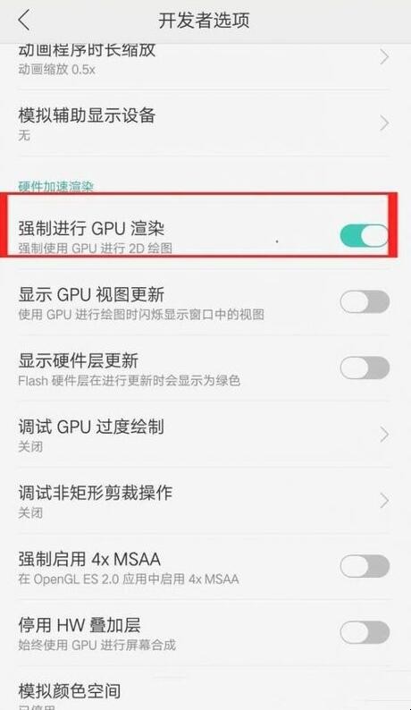 2、在手机的设置中就会出现【开发者模式后】选项,点击强制进行GPU渲染。强制后便可做到渲染整个画面,做到“指哪打哪”般的迅速和准确。