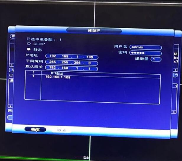 7、再用同样的方法改一下192.168.1.108的,同样是勾选:192.168.1.108之后点修改IP,在进到的这个页面之后把IP地址栏改为:192.168.1.199(最后一个数字在2-254之间),然后输入摄像头的用户名和密码。然后点确定。