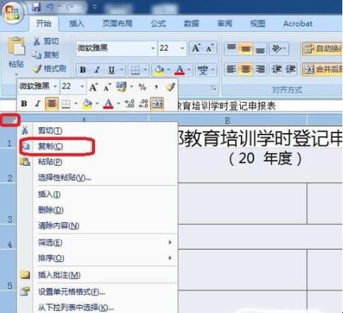 2、如图所示,右键单击表格左上角交汇点区域,选择“复制”。