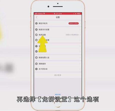 2、然后找到个人中心里的【设置】选项,进入设置界面后,再选择【免拼设置】这个选项。