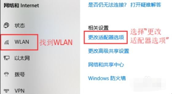 2、然后找到并点击”WLAN“选项,在右边找到“更改适配器选项”并点击。