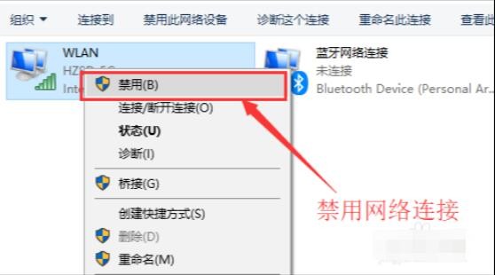 3、在打开的网络连接界面中,找到无线连接“WLAN”,右键单击选择“禁用”,然后会看到WLAN会变成灰色,说明已被成功禁用。