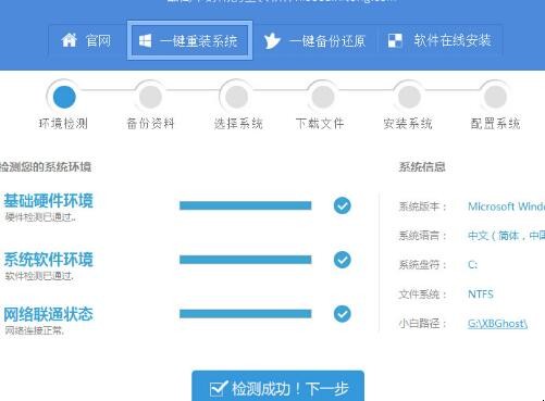 2、软件自动检测电脑软硬件环境以及电脑网络连通状态,完成后点击下一步按钮。