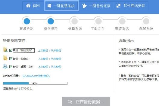 3、进入资料备份界面,通过勾选可以选择对“我的文档”、“收藏夹”、“桌面文件”进行备份,备份资料会保存到自动生成的“XBGhost/资料备份”目录内,此目录会根据电脑磁盘中最大剩余空间容量作为文件、系统的备份以及下载的系统自动产生。