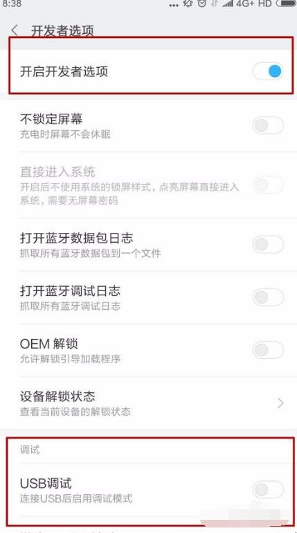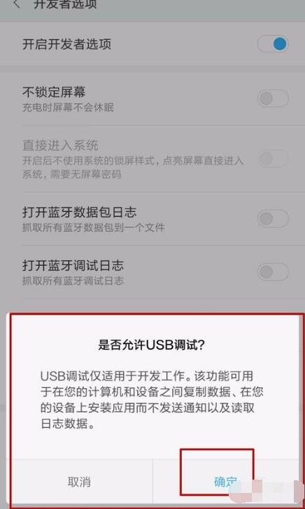 4、我们将下方的USB调试按钮开启,系统会弹出提示框是否允许USB调试,我们点击确认即开启了USB调试。