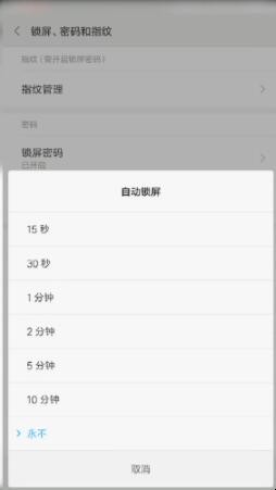 3、在锁屏栏下点击“自动锁屏”,此时会弹出一个时间窗口,在窗口中选择一分钟,即可将亮屏时间设置为一分钟。