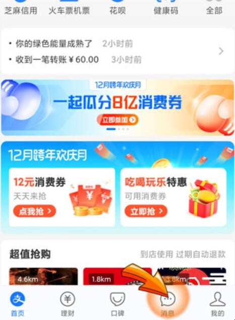 1、打开支付宝APP,点击首页右下方的“消息”图标。