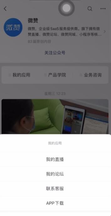 2、第2步:输入微赞之后点击该公众号,然后点击我的应用,接下来再点击我的直播。