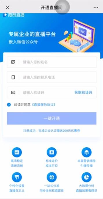 3、第3步:在跳出的页面点击一键开通直播间,输入填写姓名、手机号和验证码即可成功开通进入直播间了。