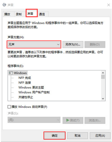 3、将弹出的小窗口切换到“声音”选项,并将声音方案更改为“无声”,点击“确定”即可。