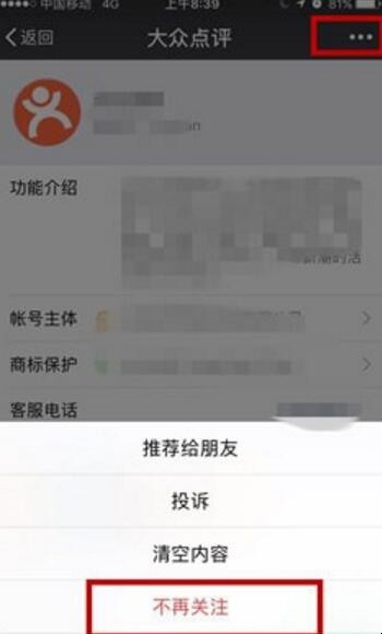 4、在公众号主页中,点击右上角的“…”菜单按钮在弹出的菜单中,点击“不再关注”即可取消关注这个公众号。