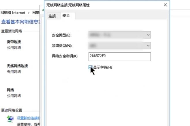 4、接着点击“无线属性”——“安全”,勾选“显示字符”即可看到WiFi密码。