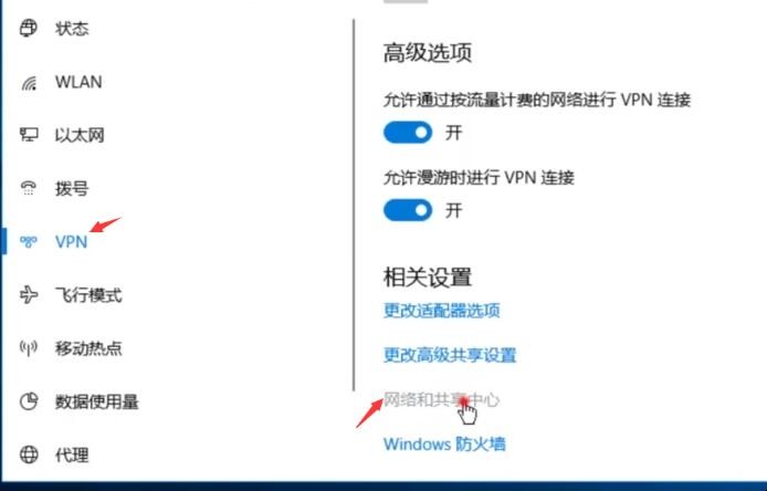 2、进入到网络和Internet”设置窗口后点击“VPN”,再找到并点击“网络和共享中心”。