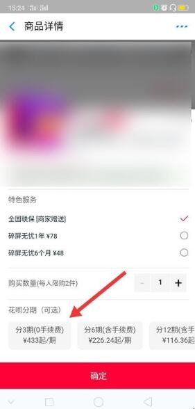 4、进入产品详情页面,点击购买下拉就可以看到花呗分期,根据情况选择期数。选择花呗分期期数之后,点击确定付款。