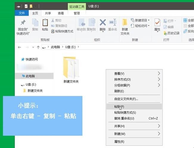 3、打开U盘,在U盘内单击右键,点击“粘贴”。