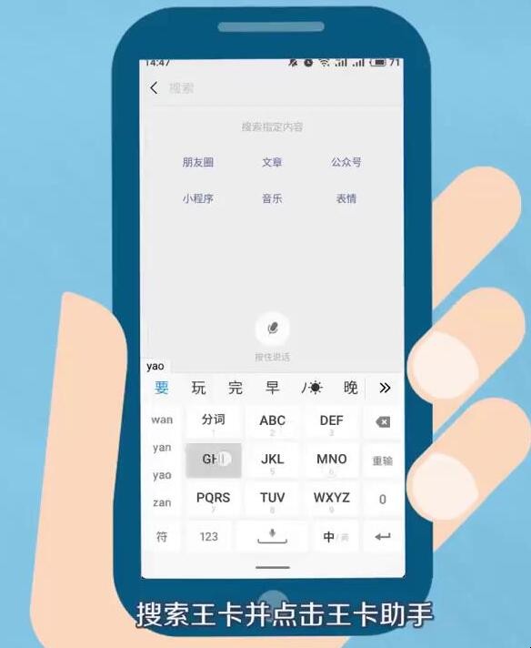 1、打开微信,点击微信上方的“搜索”按钮,搜索“网卡”,点击“网卡助手”,点击左下角“键盘”。