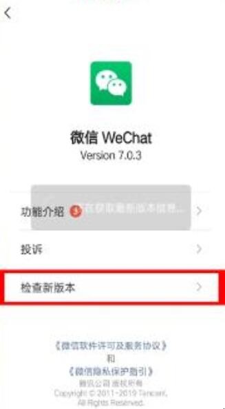 3、在关于微信页面点击“检查新版本”,如果有可更新版本,根据提示操作即可。