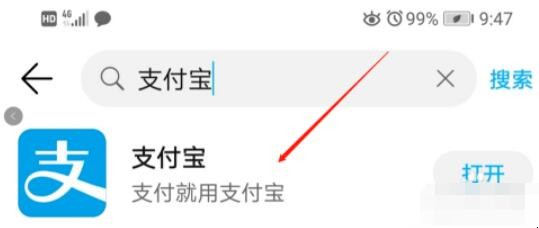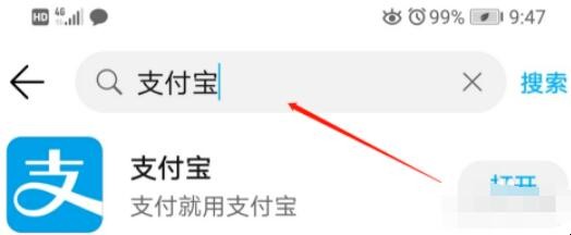 3、当我们在应用市场的搜索栏里搜索“支付宝”的关键词的时候,我们就会看到下方就会出现许多相关的软件,我们还要找到我们需要安装的软件点击即可。