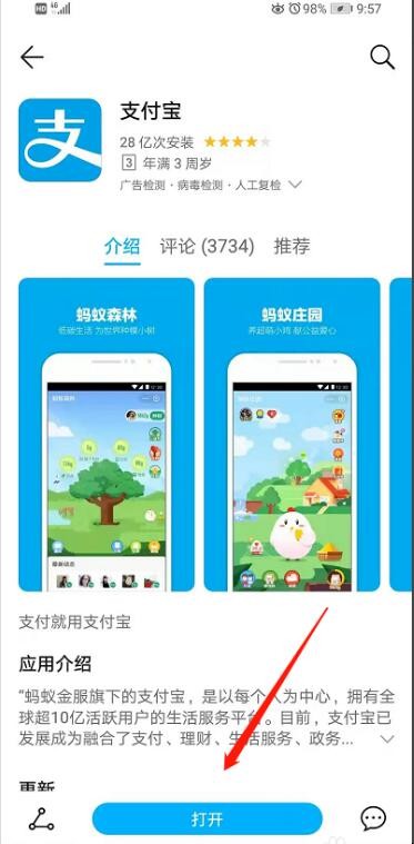 4、当我们找到我们需要下载的软件并且点击进入这个软件之后,我们会看到页面下方出现了“安装”的提示按钮,(我的是下载好的所以显示的是打开)然后我们点击以下就会开始下载安装了,安装成功之后我们就会在我们的手机准面看到”支付宝“的图标了。