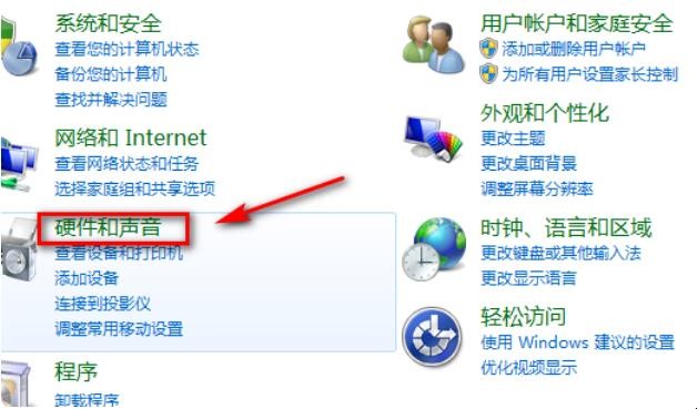 2、在控制面板中。点击选择【硬件和声音】,进入【硬件和声音】的设答置界面。