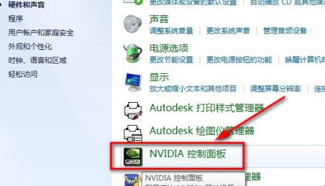 3、在【硬件和声音】的设置界面。找到最下方的【NVIDIA控制面板】,点击进入进行设置。