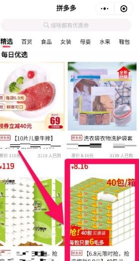 1、首先,打开手机上面的拼多多进入,选择要购买的商品店铺进入