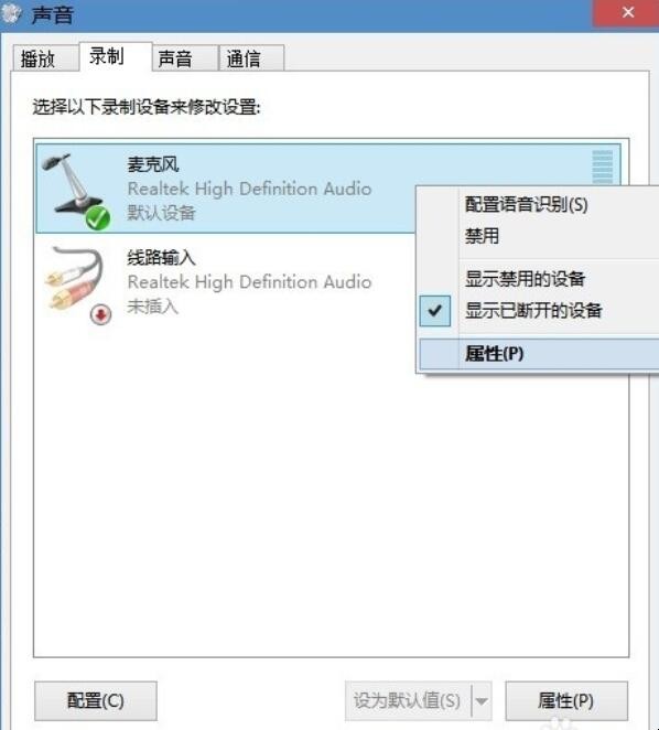 2、随后出现声音的控制面板,右键麦克风选择属性。