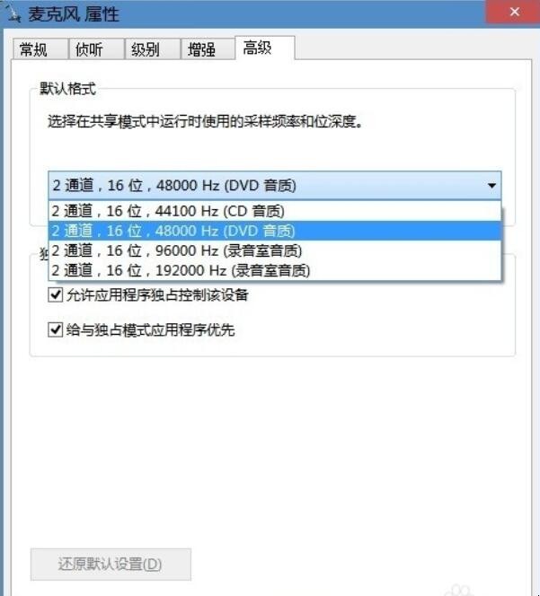 3、然后切换到高级选项卡,可以看到默认格式,就可以选择质量了。注意:慢慢提升品质看效果,如果可以就不要再提升了