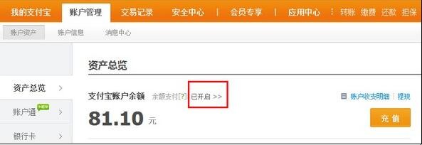 1、登录支付宝账户,点击【账户管理】——【账户资产】——【资产总览】——【已开启】。