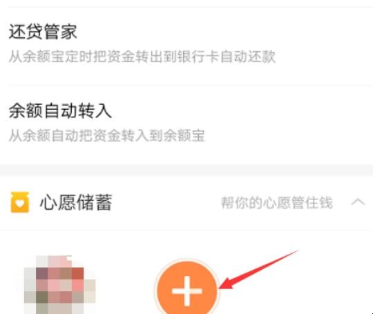 2、进入余额宝后往下拉就会看到心愿储蓄功能,或者直接在搜索栏进行搜索即可,点击加号许下心愿。
