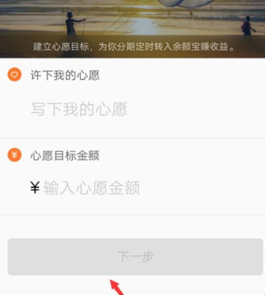 3、首先输入心愿名称以及目标金额,然后点击下一步,目标金额要在200以上。