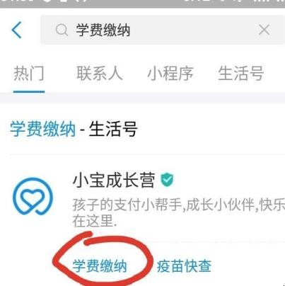1、首先打开支付宝,在主页搜索“学费缴纳”,然后点击进去。
