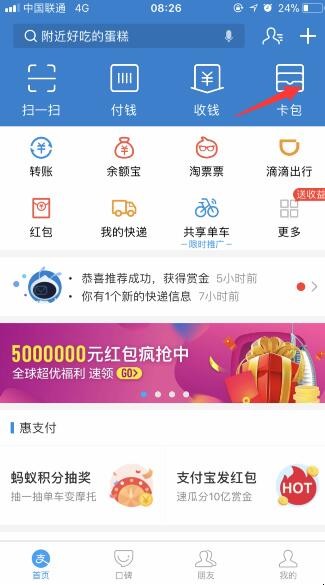 1、打开支付宝首页里面的卡包,右上角第一栏,如图。