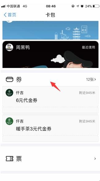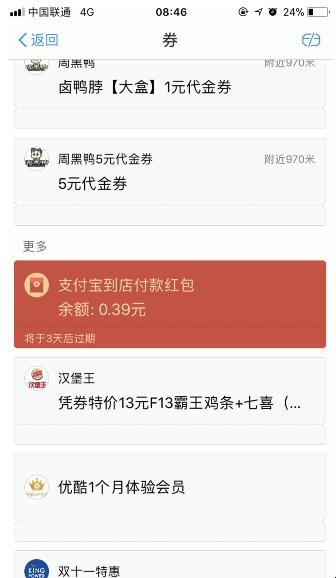 2、在卡包里我们可以看到各种优惠券,将页面拉到最下方,查看更多优惠券。