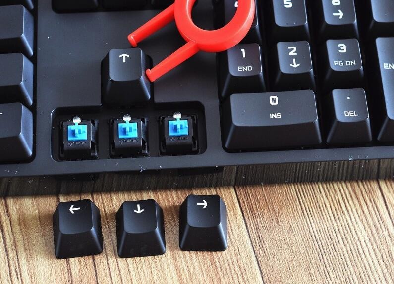 3、借助金属拔键器:准备好一个拔键器,找到键帽合适的切入点按下去,然后左右晃两下、轻松一提,这样机械键盘的键帽也就可以取下来了。