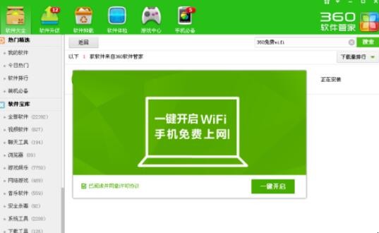 2、在确保你的电脑已经连接上网络之后,去360软件市场下载软件“360免费WiFi”。下载后安装软件。