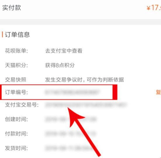 5、下拉即可看到订单编号,如下图所示。订单编号即是淘宝订单号。