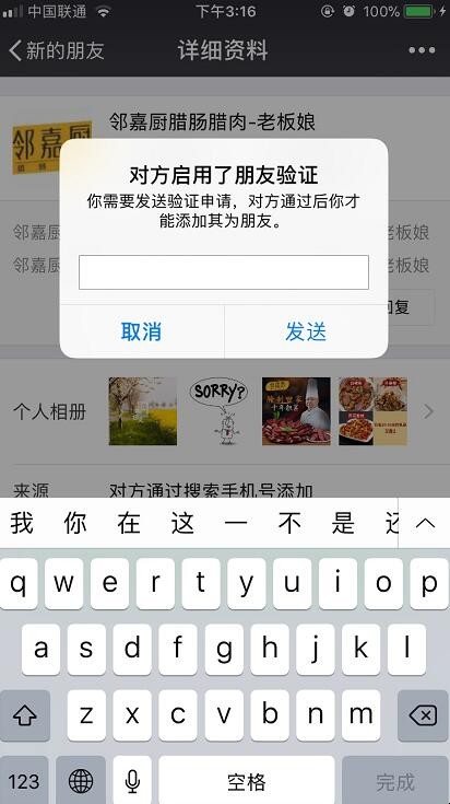 5、发送申请添加对方好友的验证消息(框里信息可填可不填),点击发送,等待对方同意后就加上了。