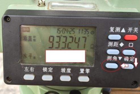 3、第三步,打开电子经纬仪,把对中激光灯打开,这台仪器的步骤是【开关】-【灯光】–【测角】,按照这个顺序按键,就可以打开对中激光。