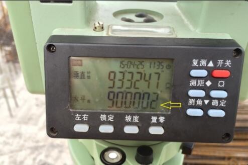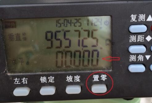 4、第四步,【后视】:仪器架设在一个激光板上方,后视另一个相邻直线的激光板接点位置,待上下、左右【制动螺旋】固定完成以后,点击【置零】,此时仪器屏幕上面的角度读数自动变为”00000“。