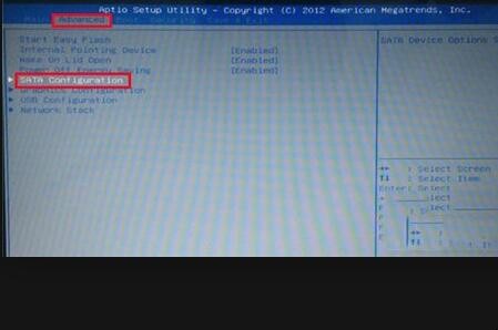 2、然后在弹出来的窗口中通过键盘上的左右方向键将光标移动到“Advanced”,然后再按上下方向键选择“SATAConfiguration”,按回车键确认。